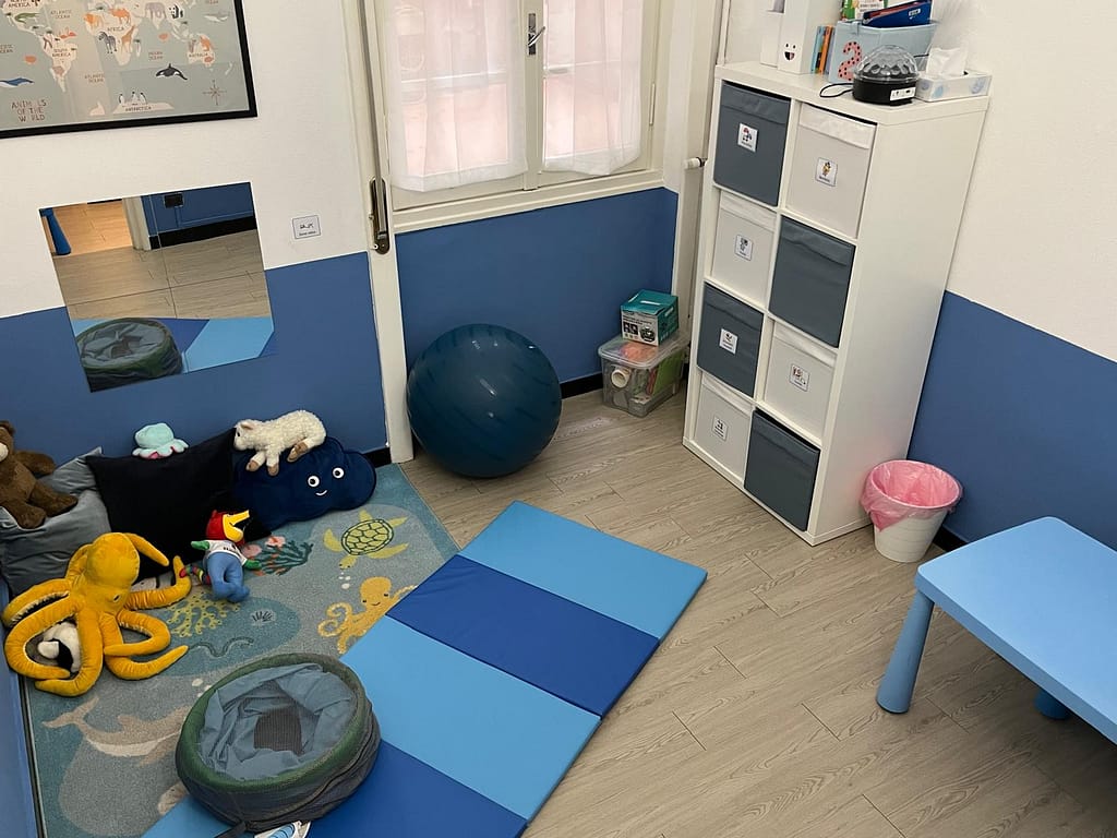 Si tratta di una stanza sensoriale che offre un angolo morbido ed attività ad alta stimolazione sensoriale e regolazione emotiva.
